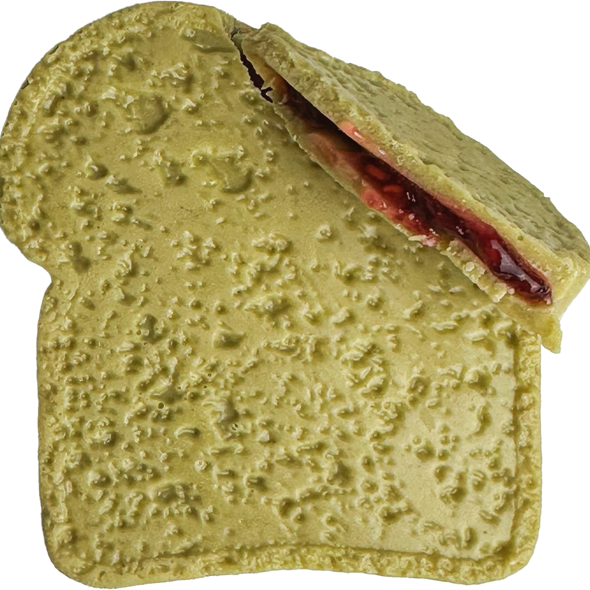 Die vegane weiße Schokolade außen ist mit echter Pistazie verfeinert, leicht süß und angenehm nussig. Innen steckt eine weiche Füllung aus Himbeere mit feiner Säure, die das Ganze ausgleicht.